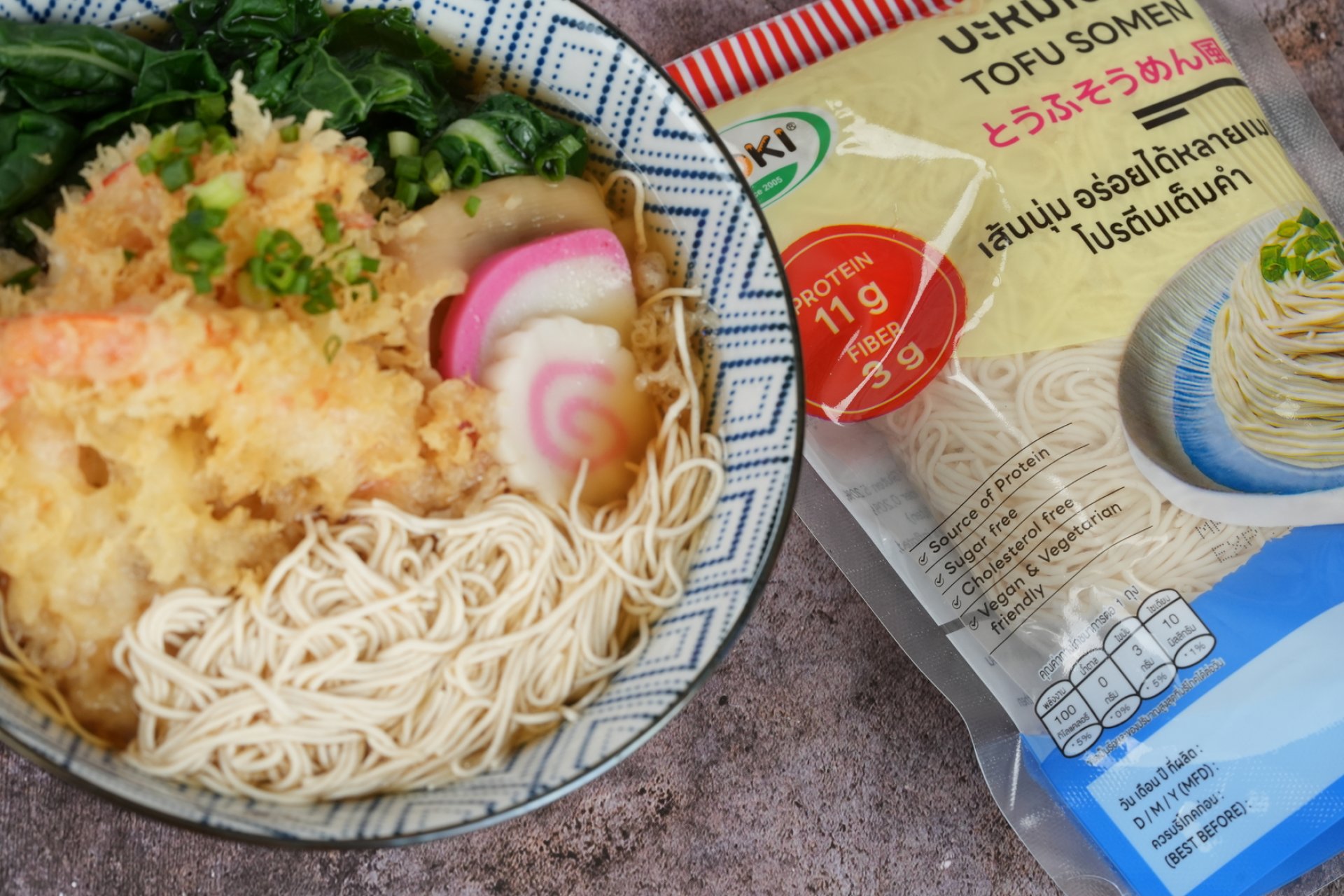- นำเส้นบะหมี่เต้าหู้ใส่ชามที่เตรียมไว้ เทน้ำซุปลงในชามที่มีเส้น วางกุ้งเทมปุระตรงกลางชาม ตามด้วยสาหร่ายวากาเมะ เห็ดชิเมจิลวก และต้นหอมญี่ปุ่นซอย